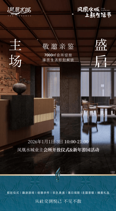 凤凰水城始终坚守初心,不做一次性的建筑交付,只愿与业主相伴成长。这份美好,今有新篇 ——7000㎡全新业主会所,2026 年 1 月 1 日正式开放!1 月 1 日 - 3 日,现场更有热闹游园活动。诚邀您与家人,共赴这场新年之约,启幕新岁的万般美好。